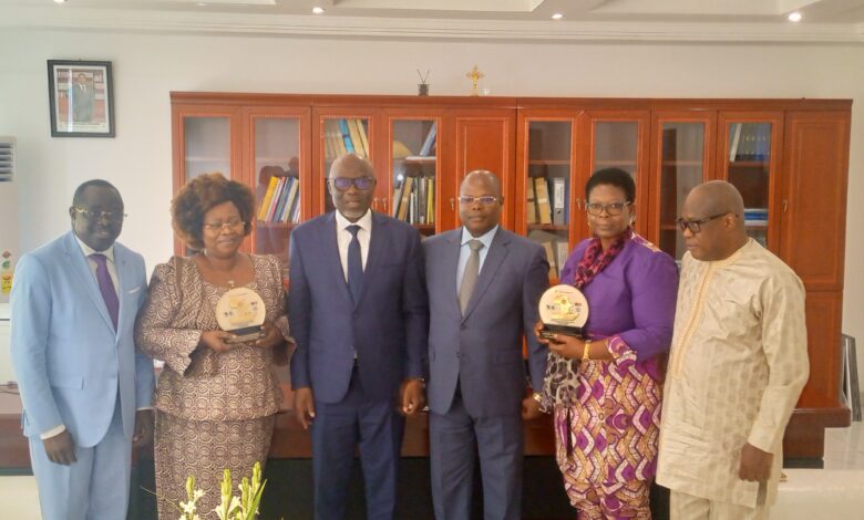 Cette double distinction a été présentée au Ministre de l’économie maritime et de la protection côtière, M. Richard KANGBENI, le mercredi 08 janvier 2025 par une délégation du Port autonome de Lomé conduite par le SG du PAL, M. Yentchabré KOMBATE, composée de M. Abdoul Razak DERMAN, Directeur commercial, M. Wily Kwamé NENE, Directeur de l’Audit interne, de Mme Abidé D’ALMEIDA BILABINA, Directrice de l’Exploitation, de Mme KOUBONOU NYANSA Sounou, Directrice du Centre-Médico-social et de M. Ahimane-Tsourièl WASUNGU, Chef Service Communication, a, au nom du DG du PAL, le Contre-Amiral Kodjo Fogan ADEGNON, présenté les deux prix au Ministre de l’économie maritime et de la protection côtière, M. Richard KANGBENI.